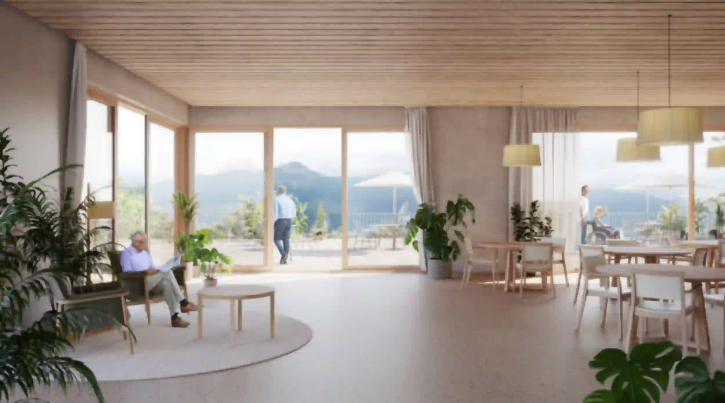 Der Neubau des Altenheims erfolgt im Zuge einer gesamthaften Betrachtung der Pflege- und Betreuungsangebote für Seniorinnen und Senioren in der Region Gruyère. Als eines von vier Projekten wird der Standort neu entwickelt und soll zukünftig 87 Pflegeplätze bereitstellen. Der vorgeschlagene Neubau bietet dabei eine kompakte Lösung auf dem topografisch stark abfallenden Gelände und bietet mit der neu geschaffenen Terrasse im Osten einen beeindruckenden Blick über das Tal auf die Alpen.