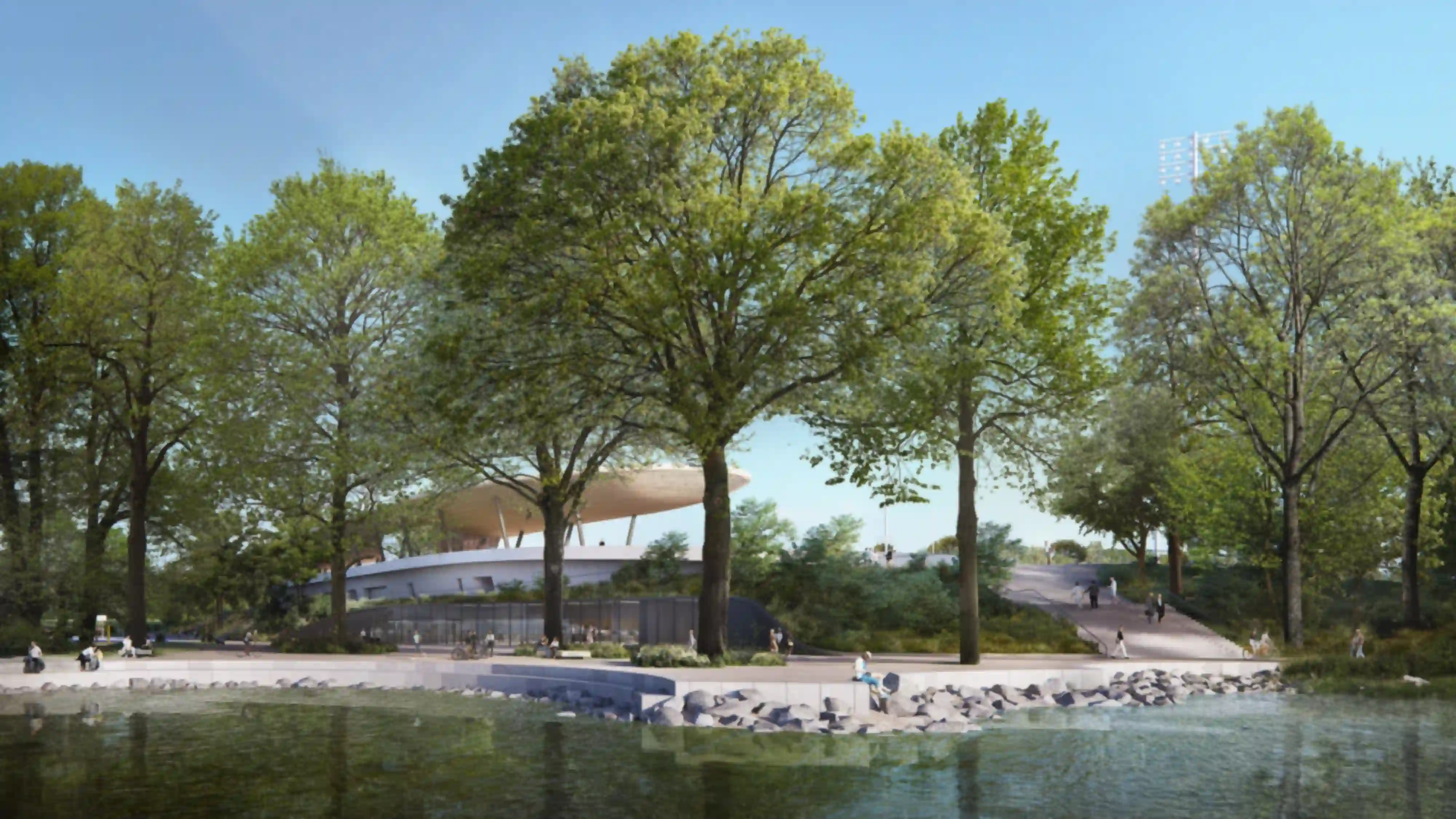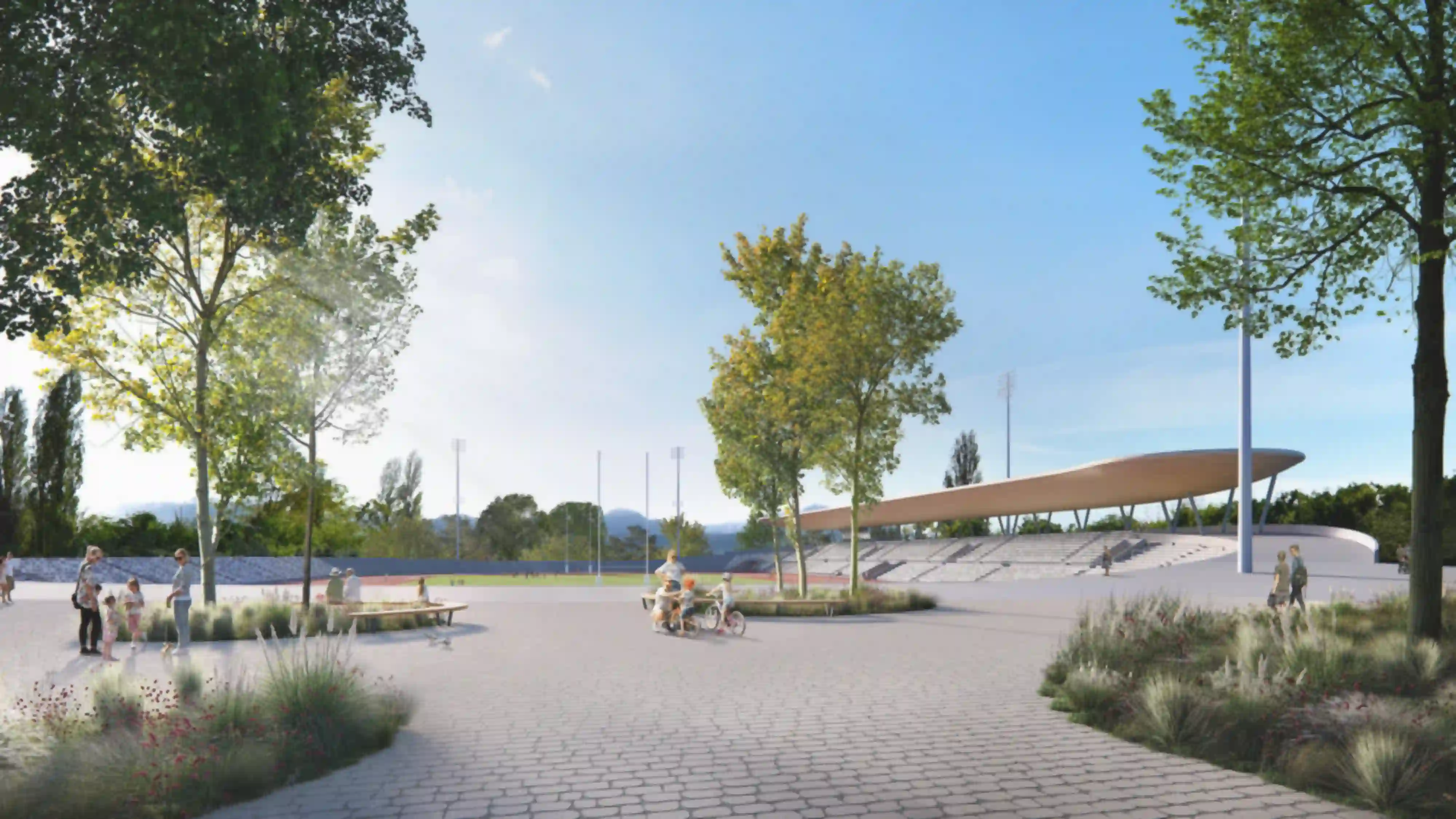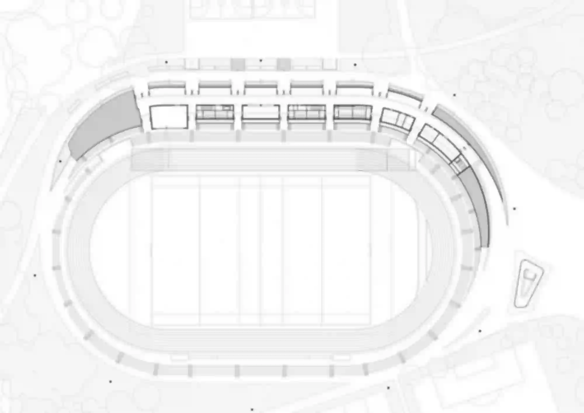 Der Entwurf zur Neuordnung des Stadions Pierre-de-Coubertin befindet sich im sensiblen Landschaftsraum am Ufer des Genfer Sees. Diesen zu schützen und in seiner Funktion als öffentlichen Raum zu erhalten ist oberste Prämisse des Entwurfs, weshalb der Grossteil des geforderten Raumprogramms in dem westlichen Hügel unterhalb der Haupttribüne verschwindet. Es werden Sitzplätze für 12'000 Besucherinnen und Besucher geschaffen, die insbesondere im Sommer ins Stadion strömen, um bei der alljährlich stattfindenden Athletissima dabei sein zu können. Durch die Einbindung der Ränge in die sanfte Topographie des Ortes gelingt dabei ein fliessender Übergang zwischen Gebautem und Landschaft, welcher Barrieren auflöst und das Stadion harmonisch mit dem Park verschmelzt.
