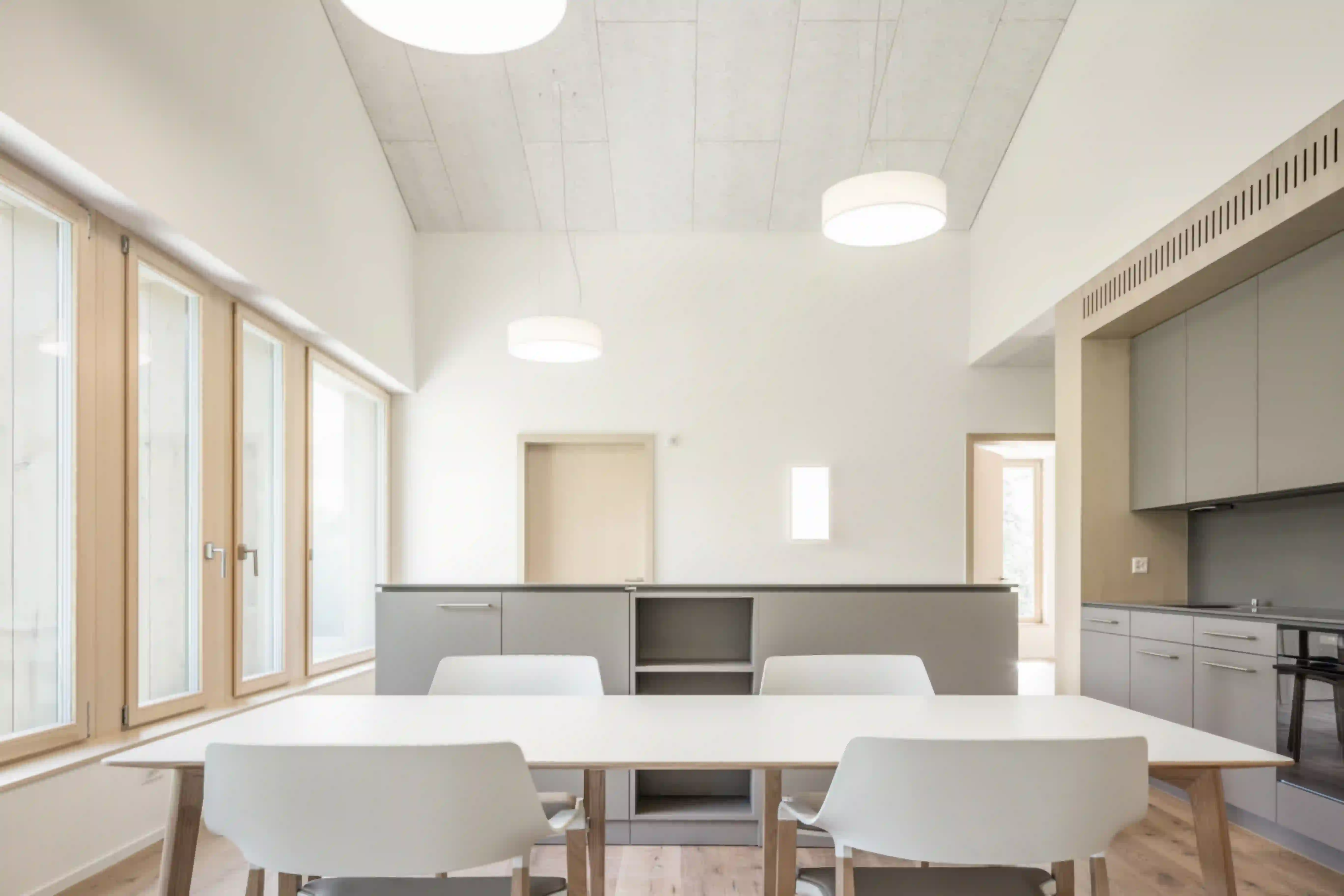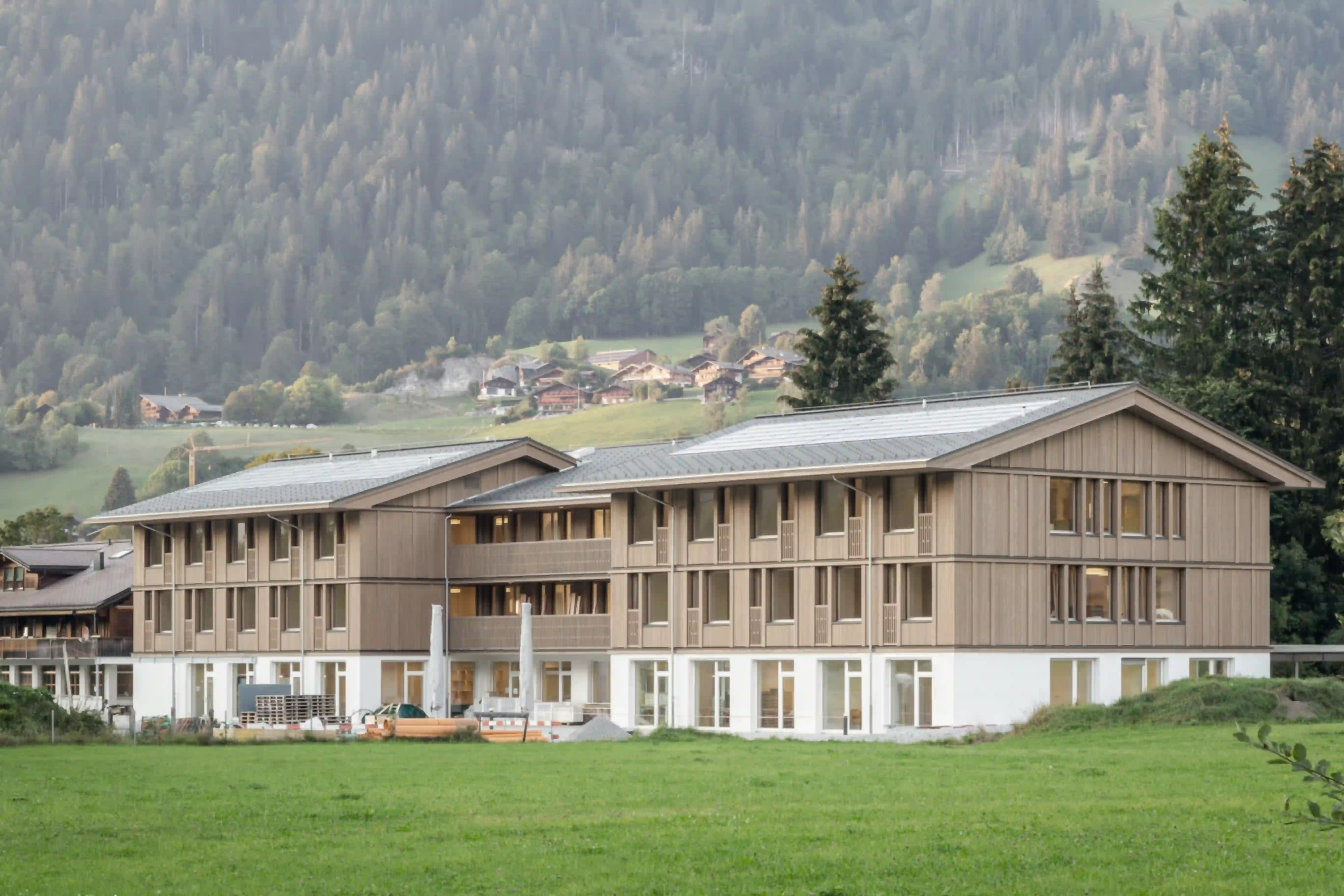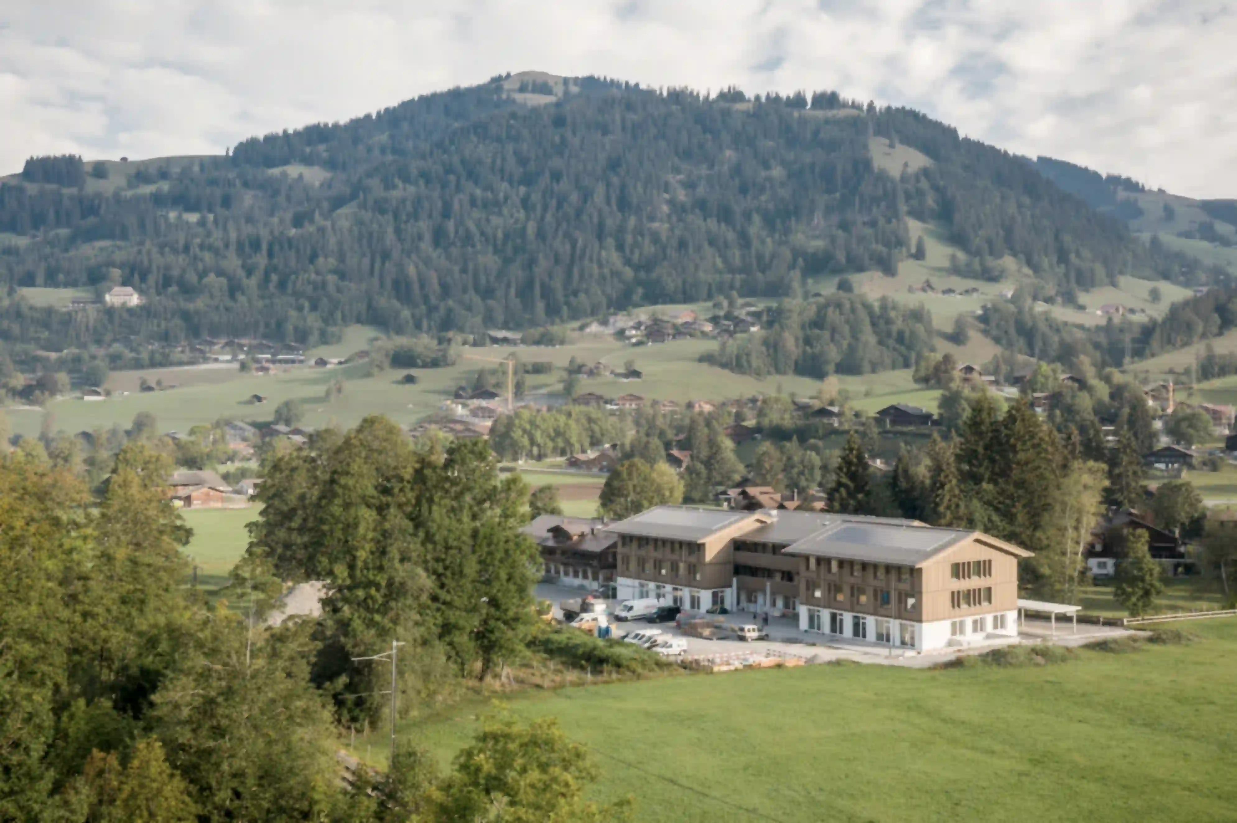 Die Stiftung Alpenruhe ist eine Einrichtung zur Betreuung und Förderung Erwachsener mit verschiedenen Behinderungen. Sie ist darüber hinaus seit langem ein beliebtes Freizeit- und Wochenendziel für Familien und Besucher der Region. Mit der Neuorganisation des Areals wird der Begegnung und Kontakt mit Besuchern mehr Raum gewährt und andererseits sichergestellt, dass die Bewohnerinnen und Bewohner ausreichend Privatsphäre sowie Rückzugsmöglichkeiten haben. Der Neubau organisiert Wohnheim und Café in einem dreifach gegliederten Volumen, dessen Architektur an die Bautradition des Saanenlandes anknüpft und dieses zeitgenössisch interpretiert. Vor- und Rücksprünge gliedern Eingang und Anlieferung und generieren an der Südseite des Gebäudes eine geschützte Terrasse. Das Erdgeschoss dient den gemeinschaftlichen Aktivitäten und der Begegnung, während in den Obergeschossen individuelle Wohngruppen entstehen. Putz, Holz und steinerne Oberflächen schaffen dabei ein natürliches und lebenswertes Wohnumfeld.