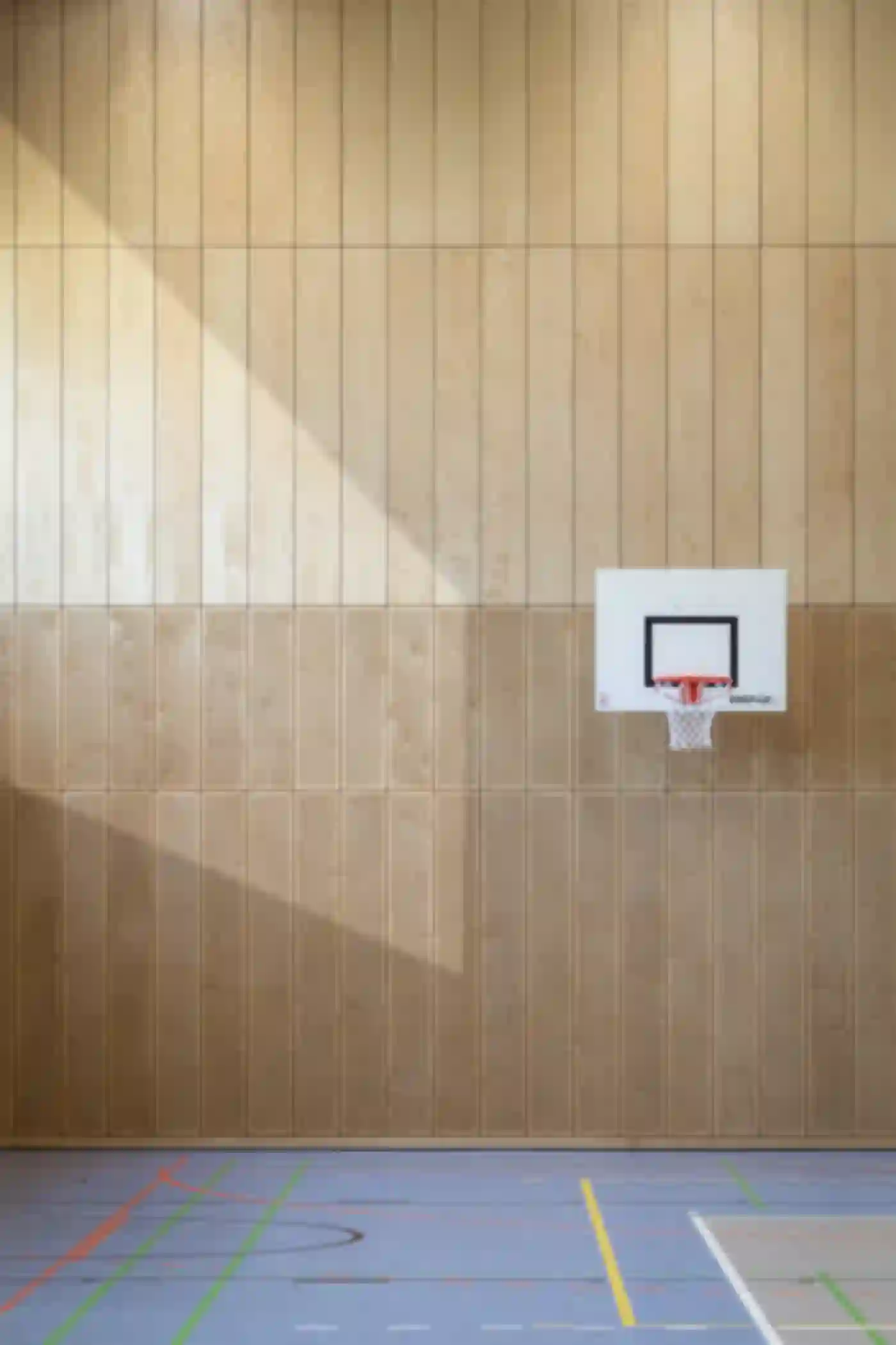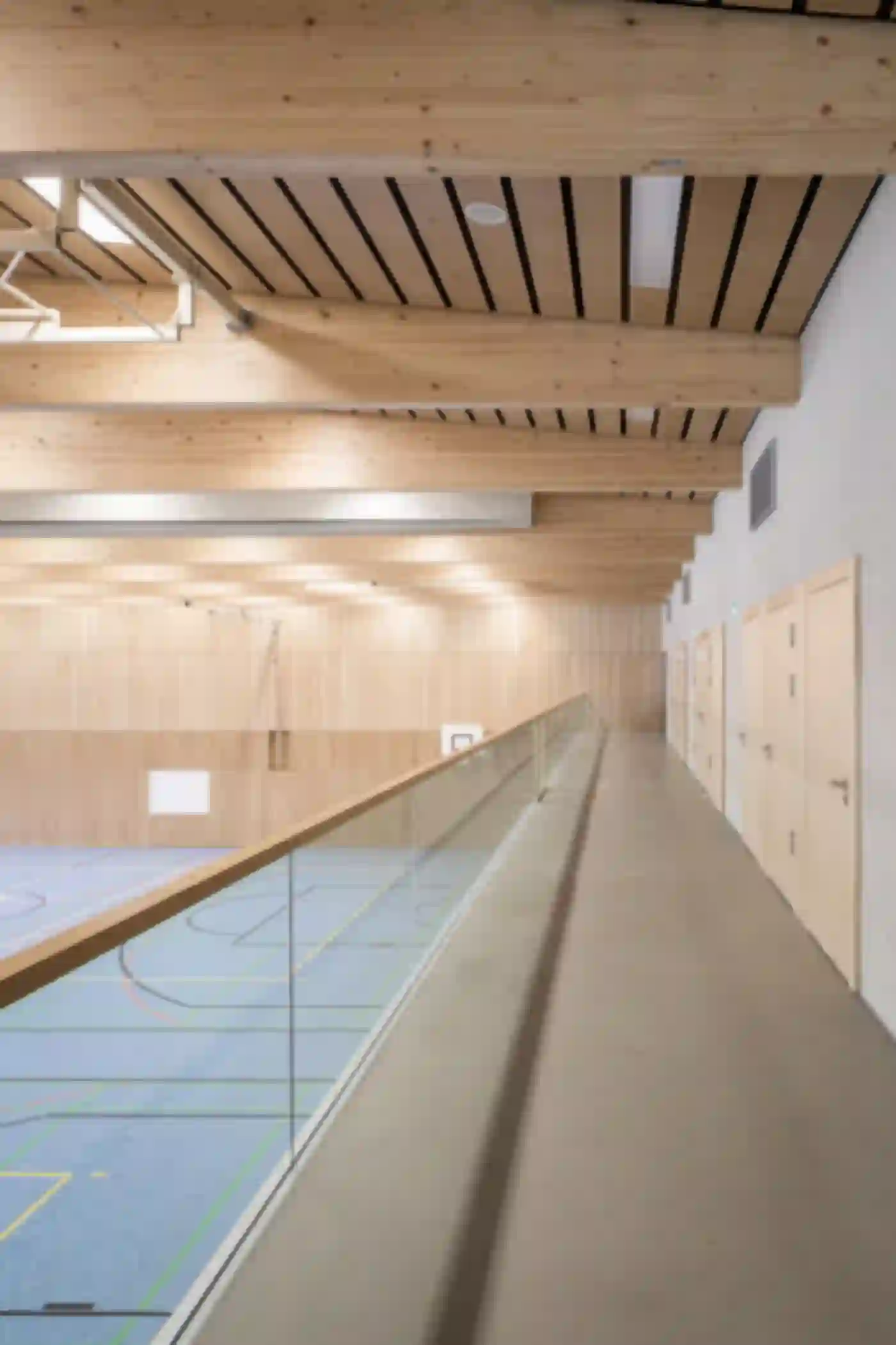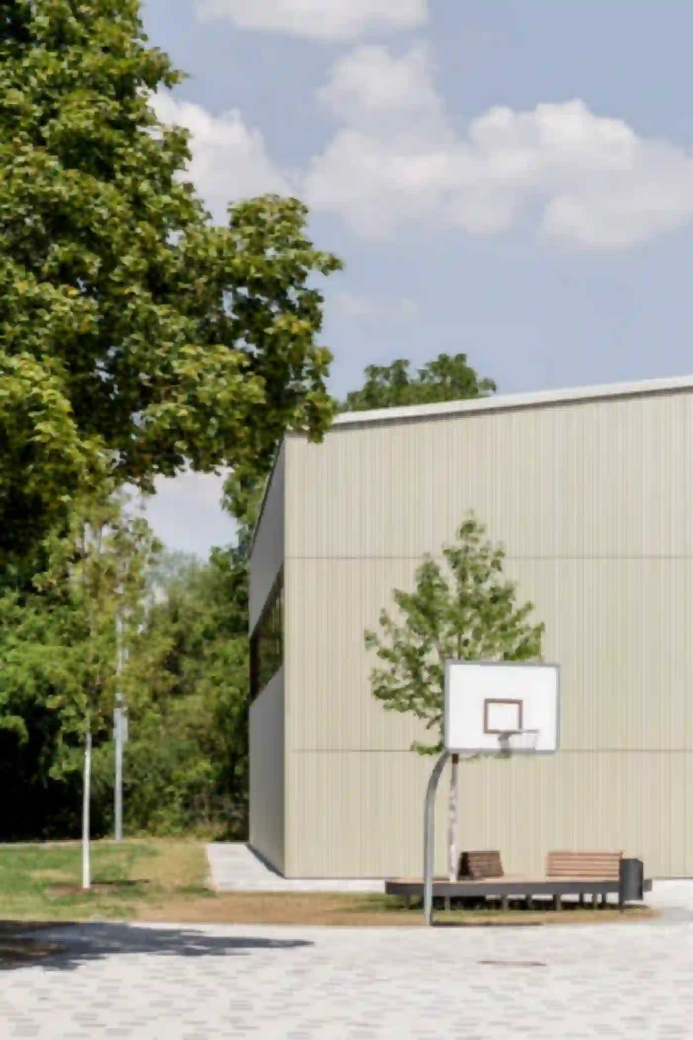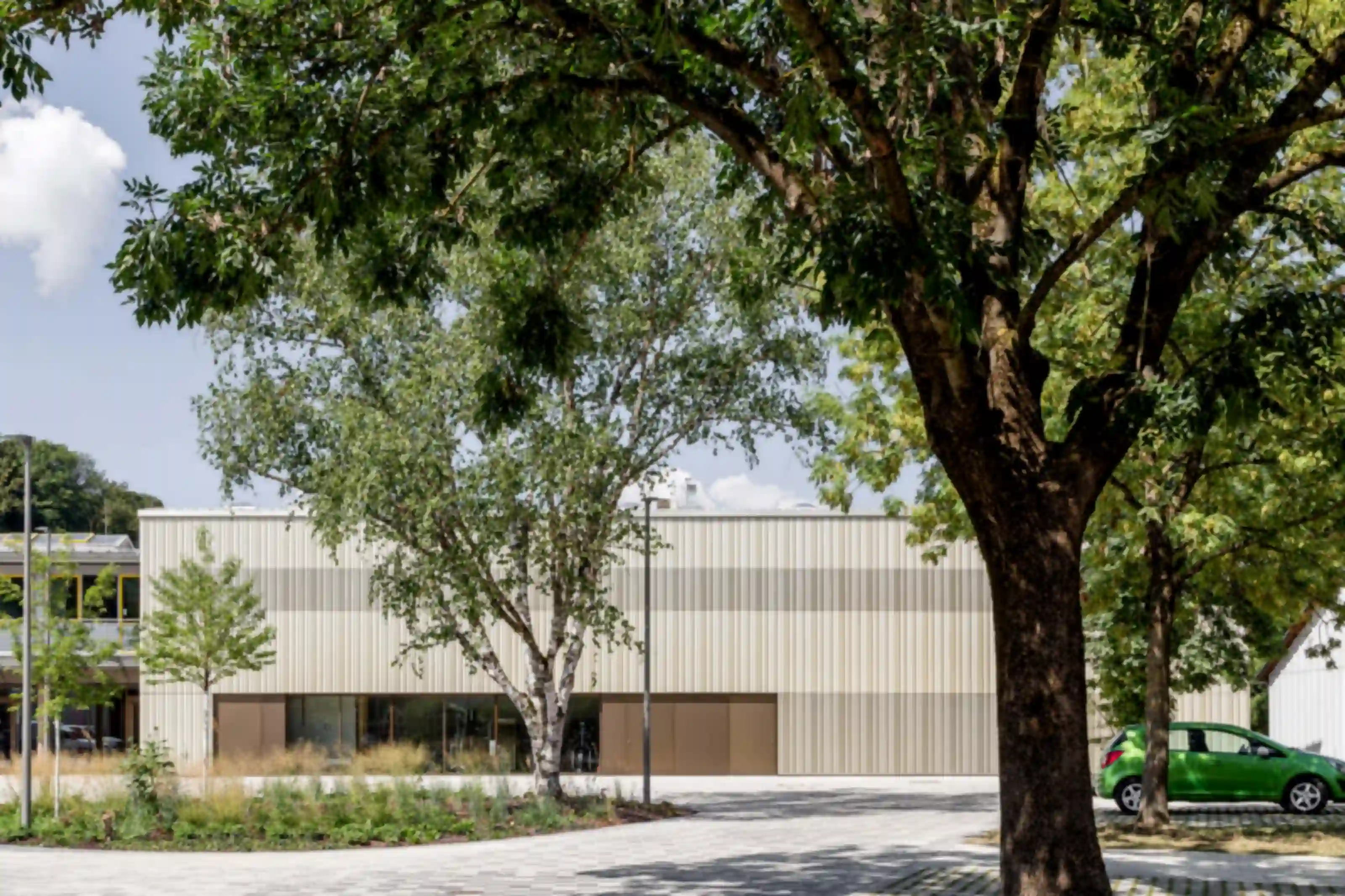 Der Neubau der Sporthalle Niederviehbach ersetzt die bisherige Einfeldhalle der Schule. Mit seiner Lage im Norden des mäandrierenden Schul- und Verwaltungsgebäudes steht die Halle als eigenständiger Baustein, dessen Erschliessung sich eng mit dem Bestand verknüpft. So erhalten Schule und Halle ein gemeinsames Foyer, welches die bisher voneinander getrennten Freiräume für die Ankunft Osten und den Pausenhof im Westen nunmehr transparent miteinander verbindet. Die Sporthalle selbst ist einfach organisert und kann durch ihren zweigeschossigen Nebentrakt kompakt in einem einfachen Volumen organisiert werden. Die Hülle präsentiert sich in strahlendem Gold, im Inneren dominieren helle Holztöne, gedeckte Farben und Sichtbeton.