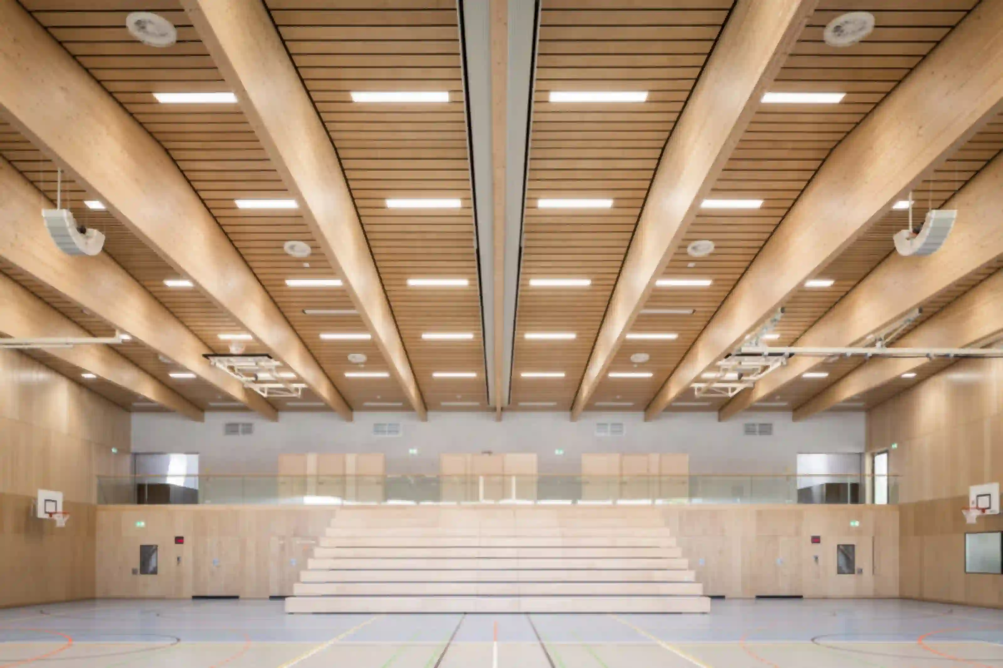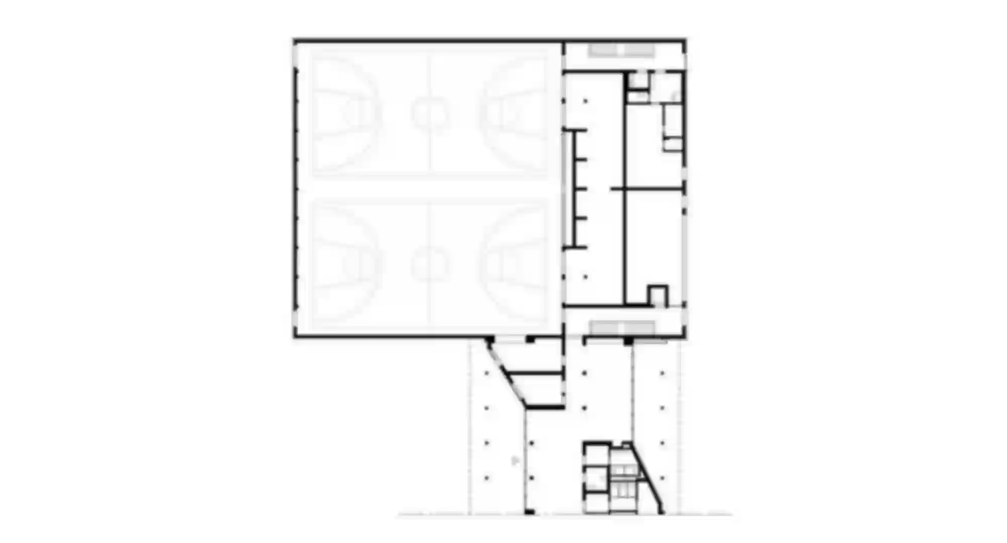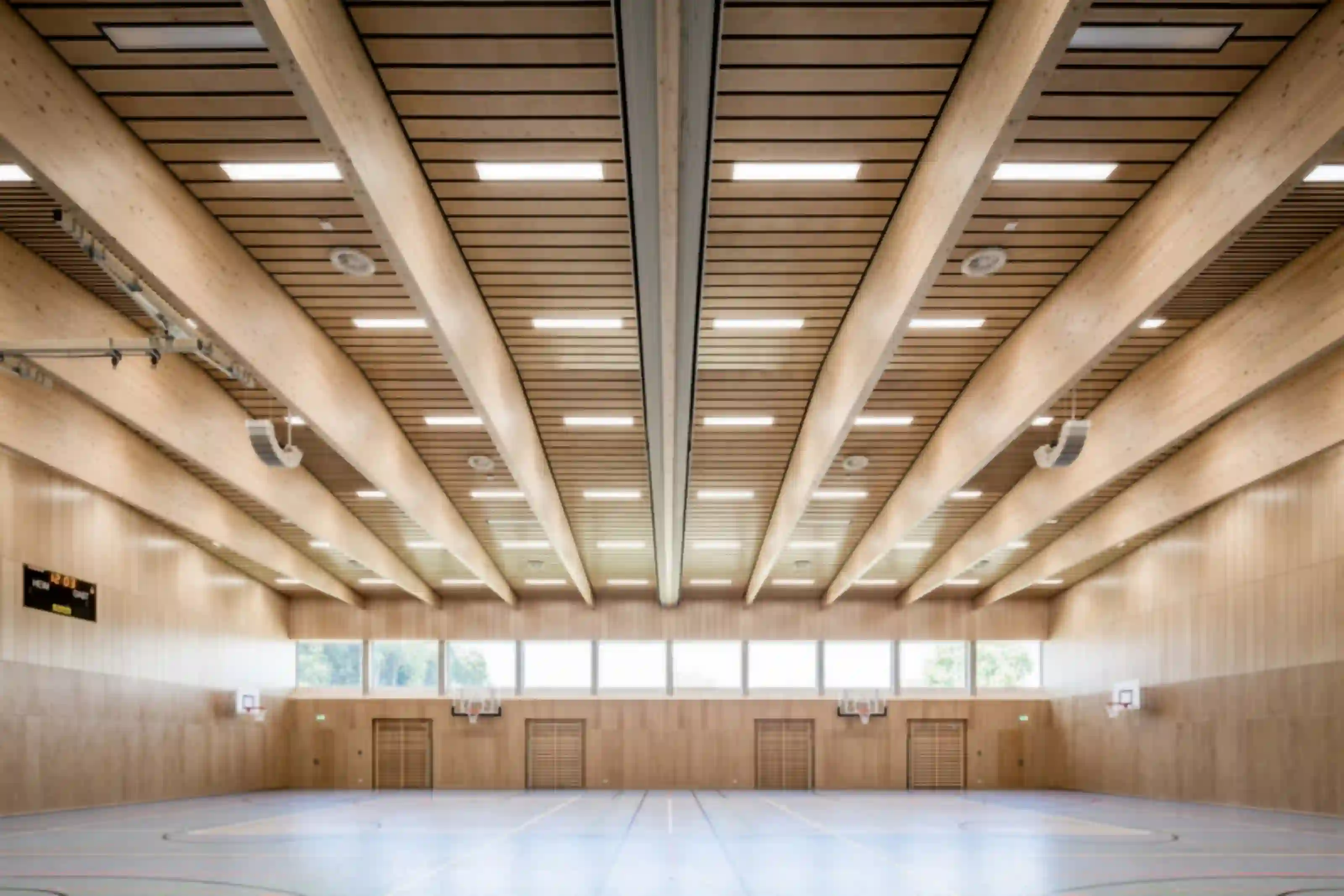 Der Neubau der Sporthalle Niederviehbach ersetzt die bisherige Einfeldhalle der Schule. Mit seiner Lage im Norden des mäandrierenden Schul- und Verwaltungsgebäudes steht die Halle als eigenständiger Baustein, dessen Erschliessung sich eng mit dem Bestand verknüpft. So erhalten Schule und Halle ein gemeinsames Foyer, welches die bisher voneinander getrennten Freiräume für die Ankunft Osten und den Pausenhof im Westen nunmehr transparent miteinander verbindet. Die Sporthalle selbst ist einfach organisert und kann durch ihren zweigeschossigen Nebentrakt kompakt in einem einfachen Volumen organisiert werden. Die Hülle präsentiert sich in strahlendem Gold, im Inneren dominieren helle Holztöne, gedeckte Farben und Sichtbeton.
