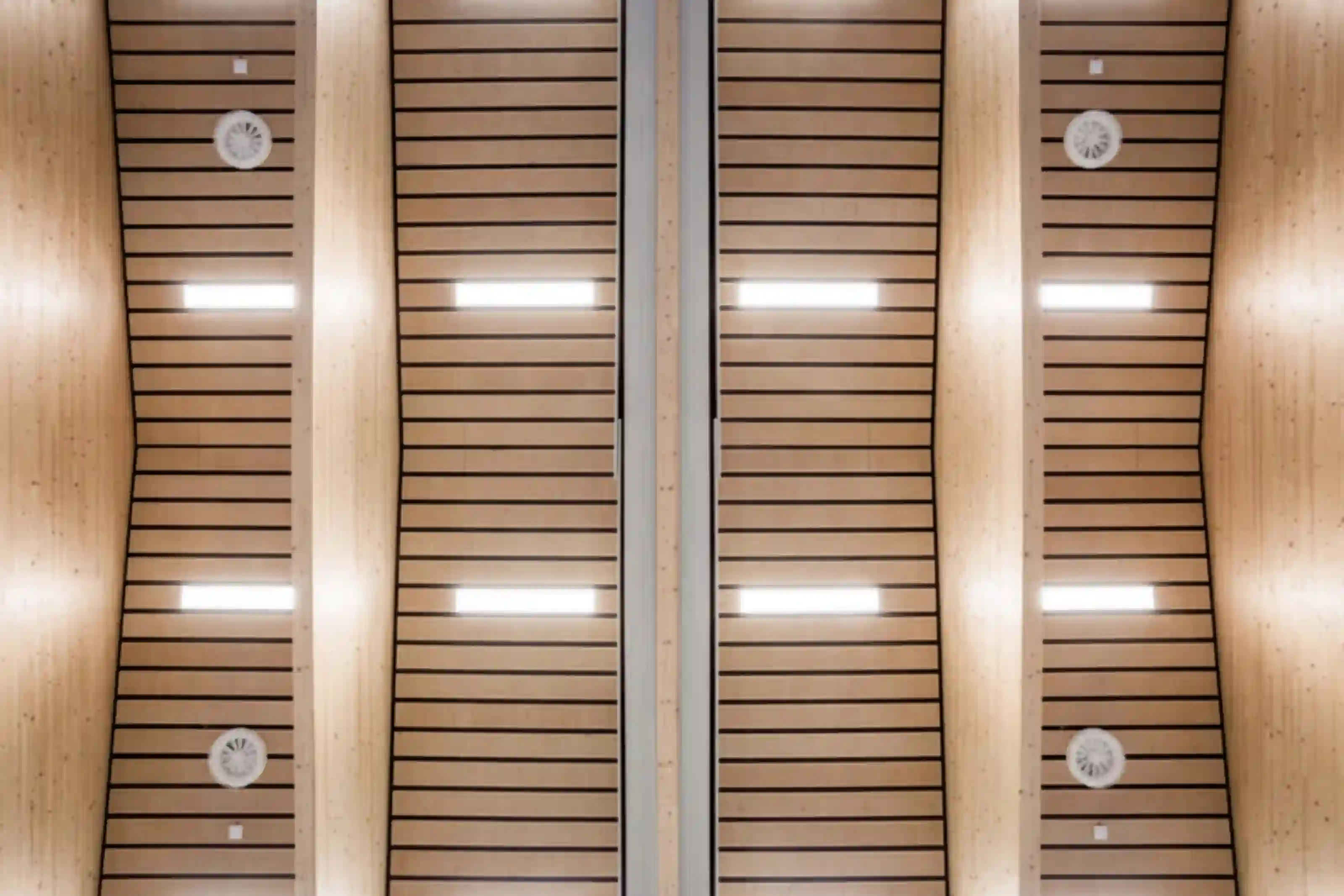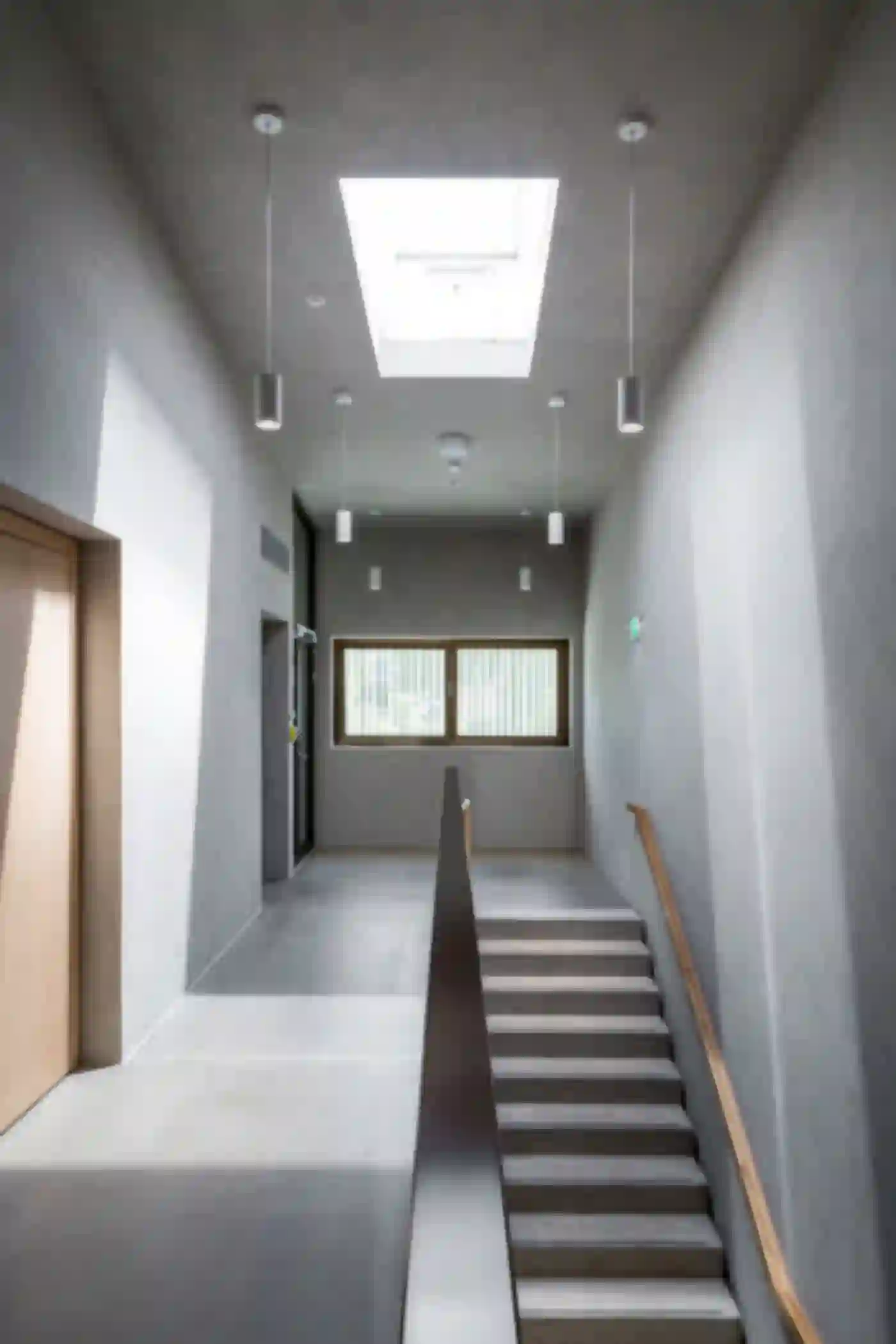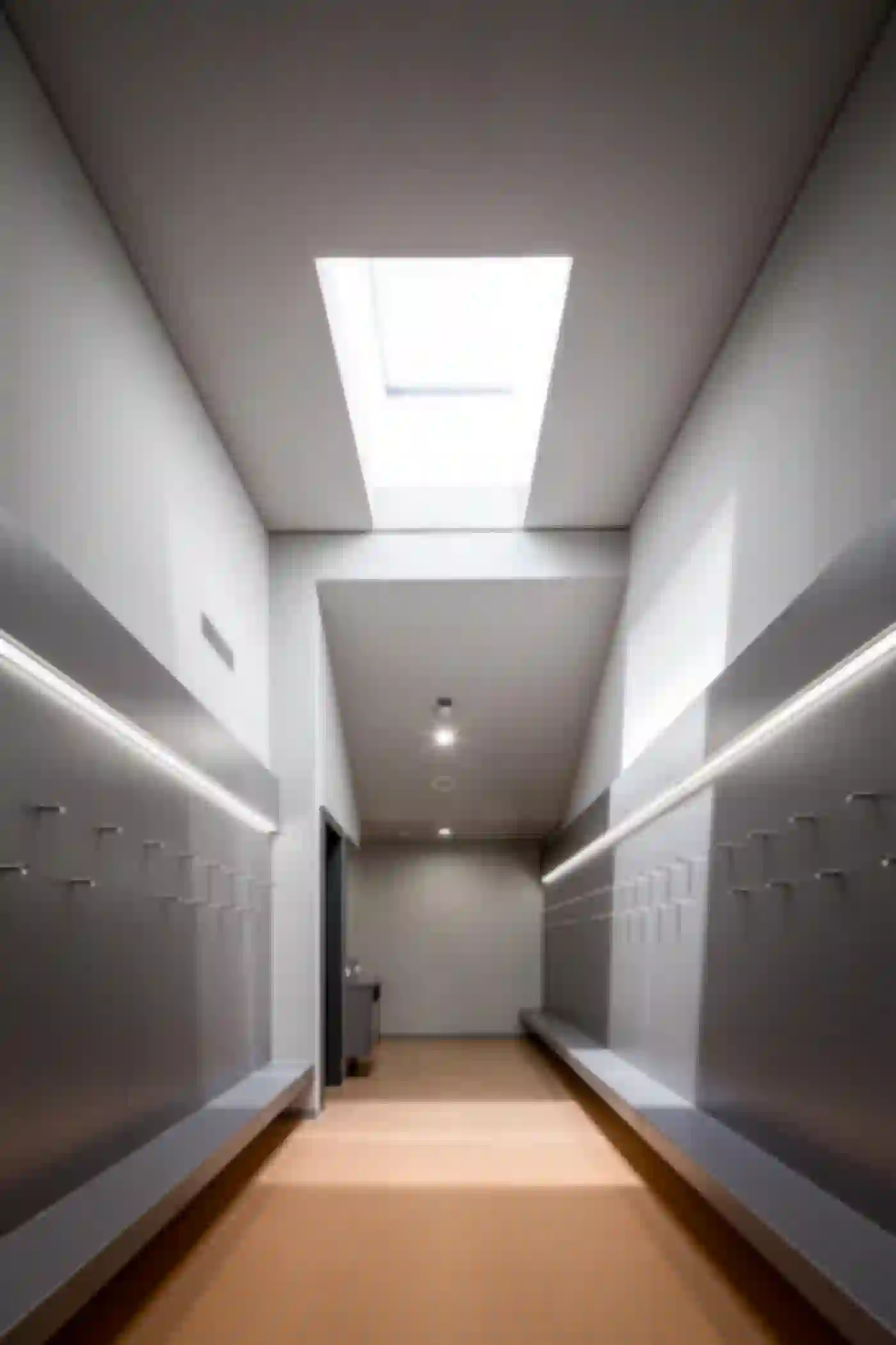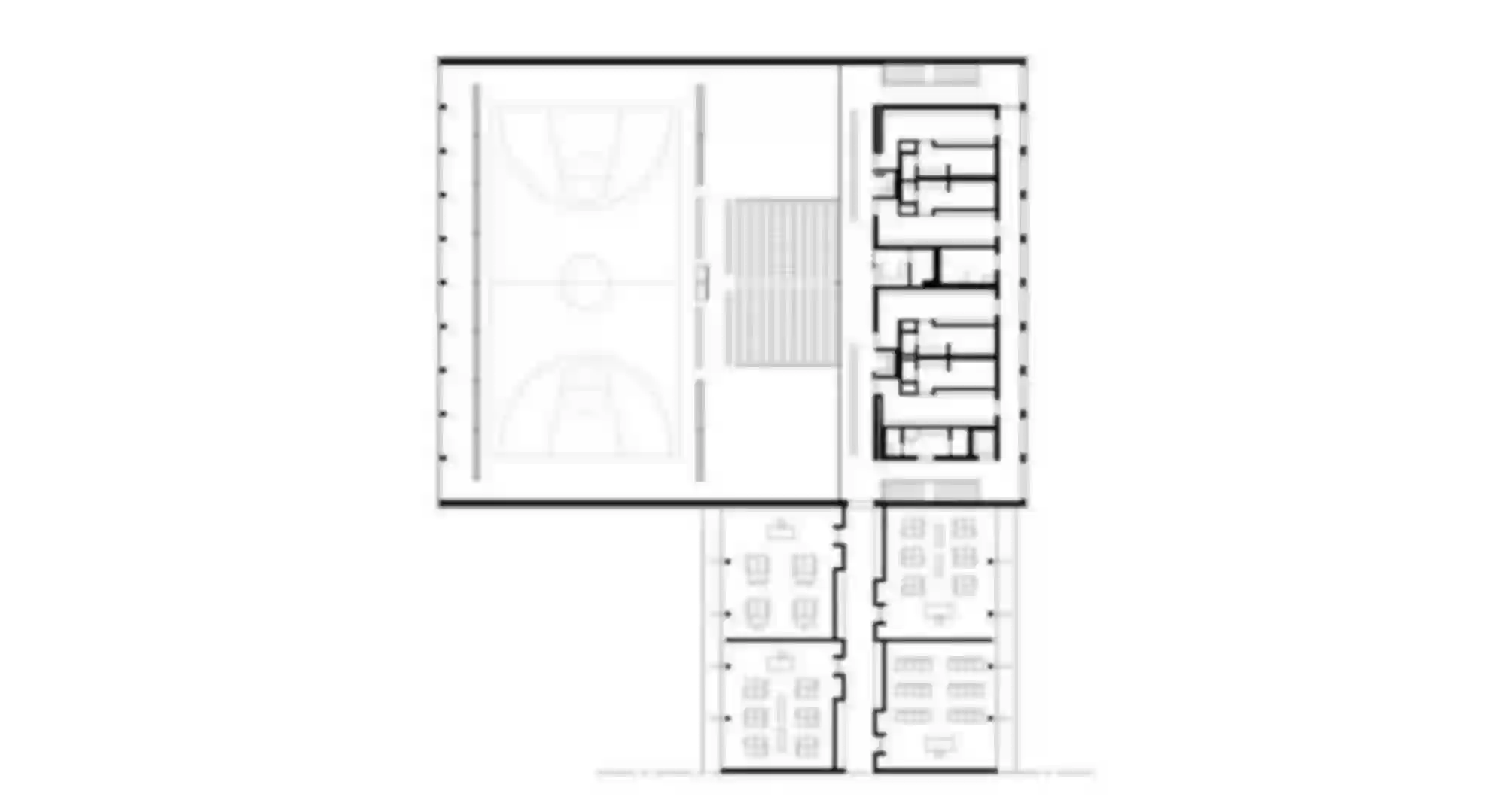 Der Neubau der Sporthalle Niederviehbach ersetzt die bisherige Einfeldhalle der Schule. Mit seiner Lage im Norden des mäandrierenden Schul- und Verwaltungsgebäudes steht die Halle als eigenständiger Baustein, dessen Erschliessung sich eng mit dem Bestand verknüpft. So erhalten Schule und Halle ein gemeinsames Foyer, welches die bisher voneinander getrennten Freiräume für die Ankunft Osten und den Pausenhof im Westen nunmehr transparent miteinander verbindet. Die Sporthalle selbst ist einfach organisert und kann durch ihren zweigeschossigen Nebentrakt kompakt in einem einfachen Volumen organisiert werden. Die Hülle präsentiert sich in strahlendem Gold, im Inneren dominieren helle Holztöne, gedeckte Farben und Sichtbeton.